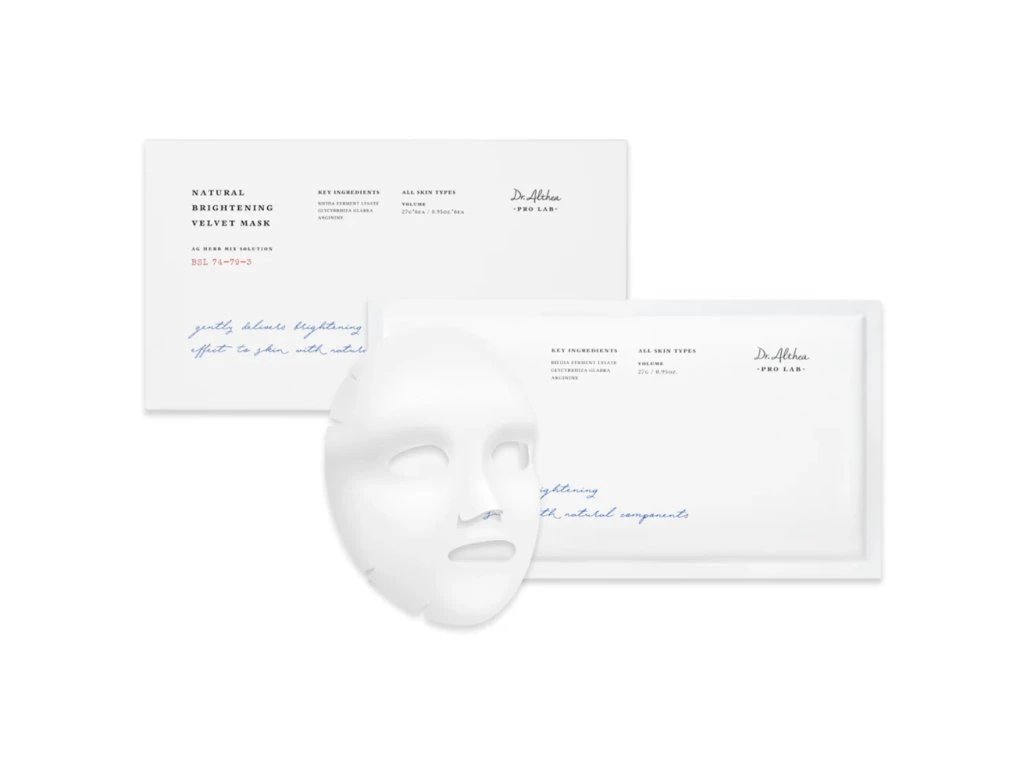Dr. Althea Natural Brightening Velvet Mask je výživná rozjasňující plátýnková pleťová maska, která doplňuje pleť o důležité hydratační a zklidňující látky a pomáhá zmírnit mdlý vzhled a sjednotit tón pleti. Je obohacena o fermentované extrakty, výtažky z lékořice, zeleného čaje a další rostlinné složky, které společně působí na zdravější a zářivější vzhled pleti. Maska je ideální pro použití jako okamžitá péče před důležitou událostí, ale i jako součást pravidelné skincare rutiny.