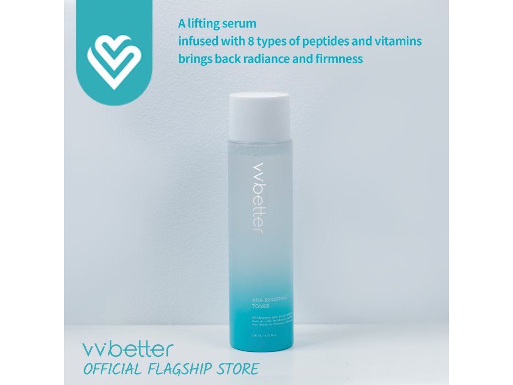 VVBETTER AHA Boosting Toner je exfoliační tonikum, které jemně odstraňuje odumřelé kožní buňky a zlepšuje texturu pleti. Obsahuje AHA kyseliny, jako je kyselina mléčná a kyselina glykolová, které mají silný exfoliační účinek, čímž podporují regeneraci pleti a zajišťují hladší, jasnější pleť. Tento toner také zklidňuje a hydratuje pleť díky přítomnosti Centella Asiatica Extract a Sodium Hyaluronate, což je ideální pro pleť, která potřebuje obnovu a osvěžení.